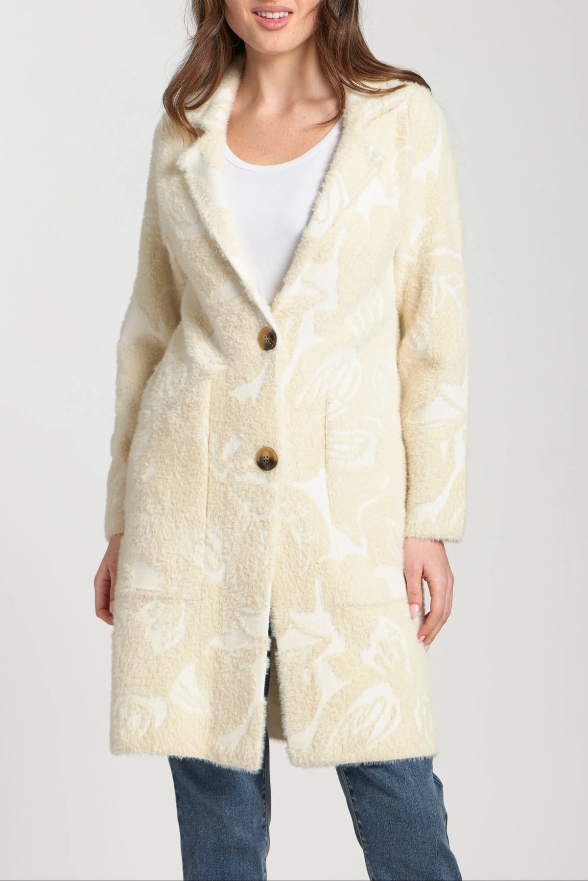 Embrace cozy chic with the APNY Longline Faux Fur Cardigan. Its super soft faux fur and subtle cream pattern offer sophisticated warmth for fall and winter. Featuring a stylish lapel and a button closure, this versatile piece layers beautifully over denim for an effortlessly elegant everyday look.