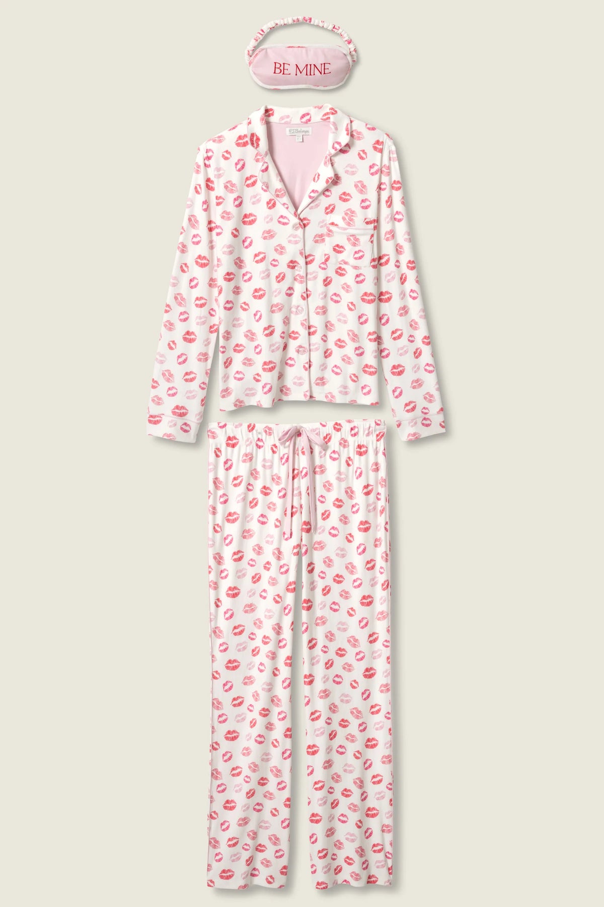 Give ’em lip. This three-piece pajama set features a relaxed button-down top and matching drawstring pants covered in pink and red kisses. Finished with a coordinating “Be Mine” eye mask, it’s the flirtiest way to cozy up this Valentine’s Day.