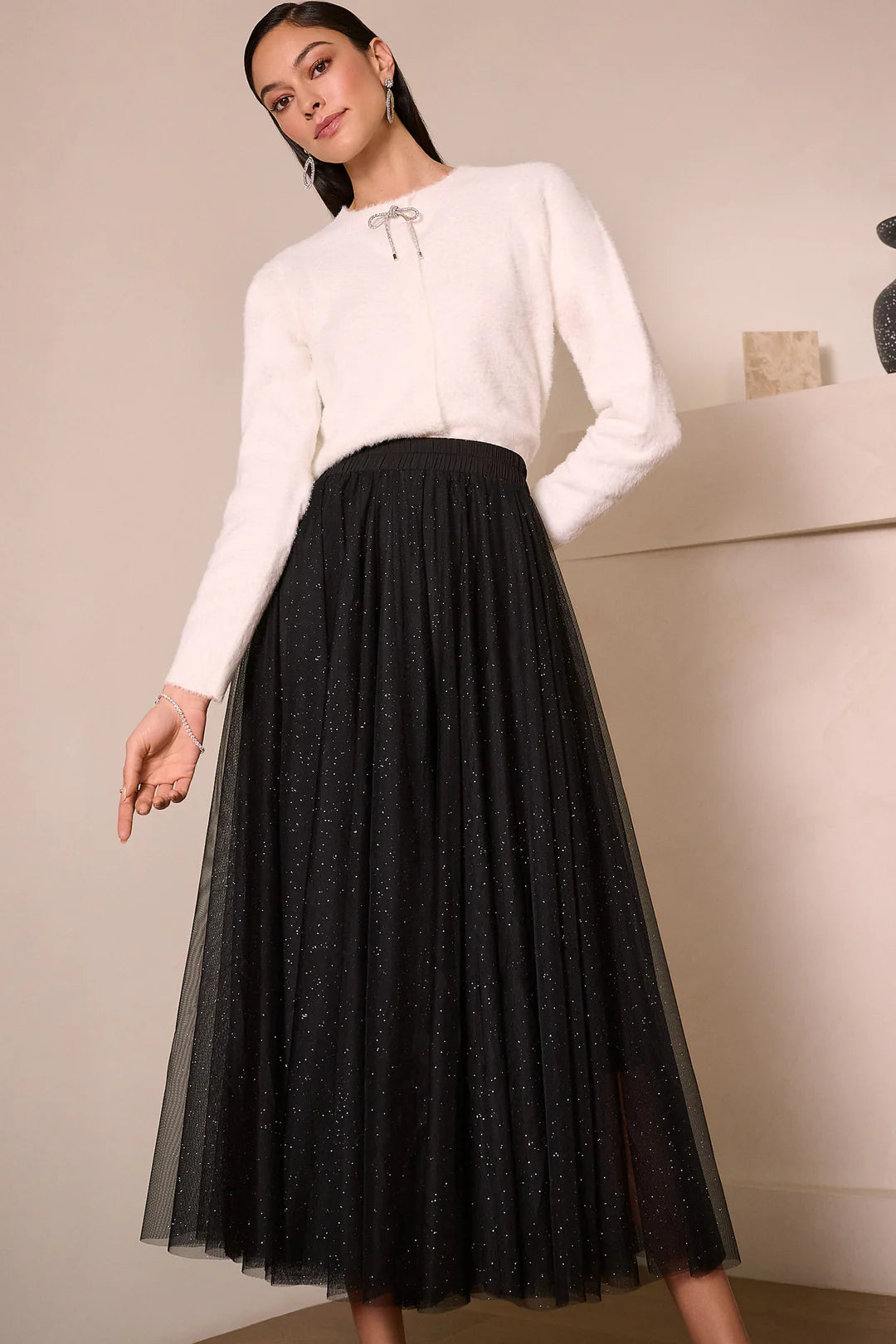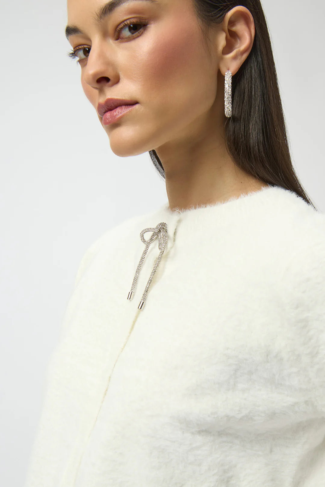 This elegant long sleeve cardigan by Joseph Ribkoff combines style and comfort with a delicate rhinestone bow at the neckline, offering subtle sparkle. Made from soft feather yarn, it provides lightweight warmth and features a discreet snap closure for a seamless fit. Ideal for layering across seasons, this piece enhances any outfit with refined detail and effortless sophistication.